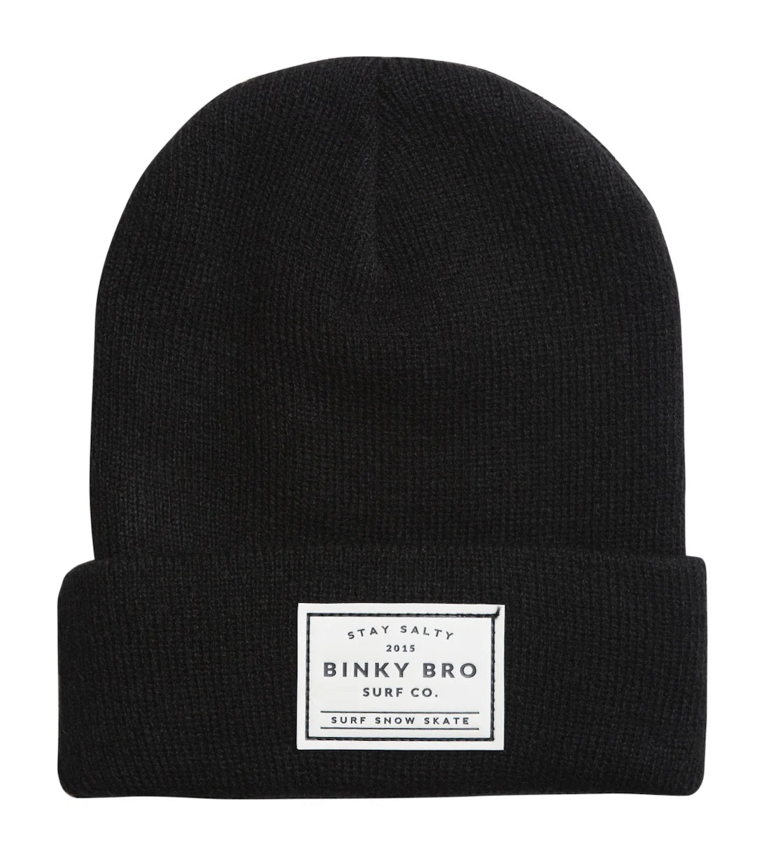 BinkyBro's black Tahoe beanie is 100% acrylic. It has a "BinkyBro Surf Co--Surf|Snow|Skate" embossed patch on the front.
