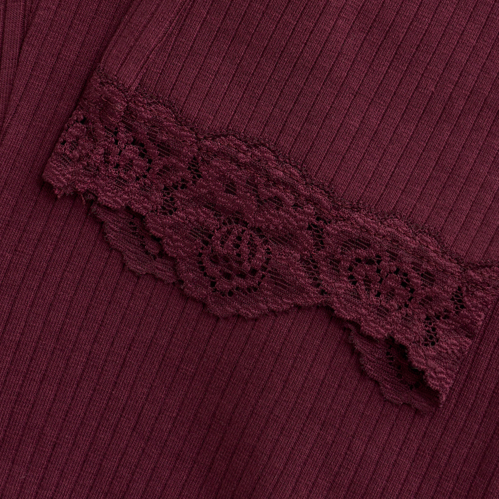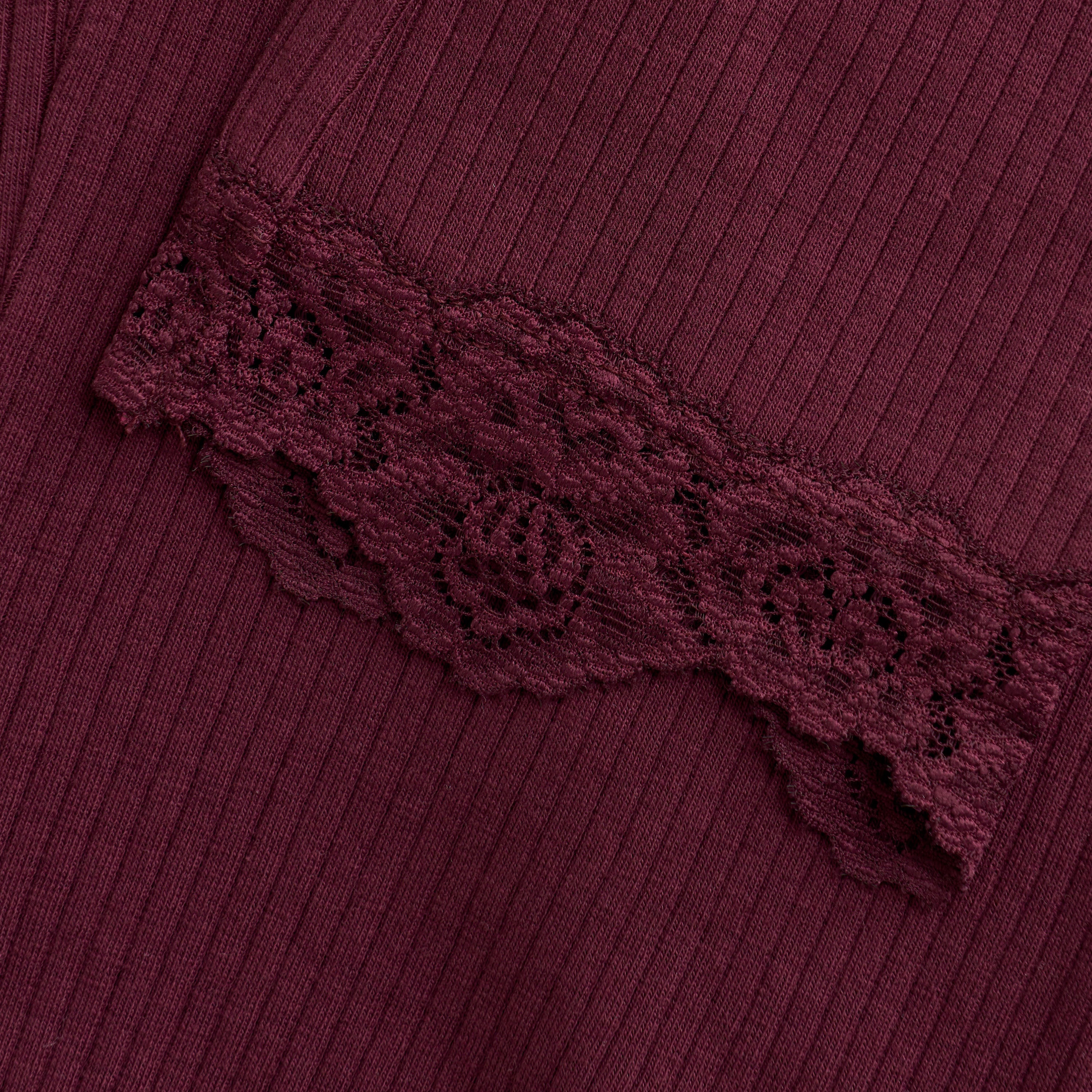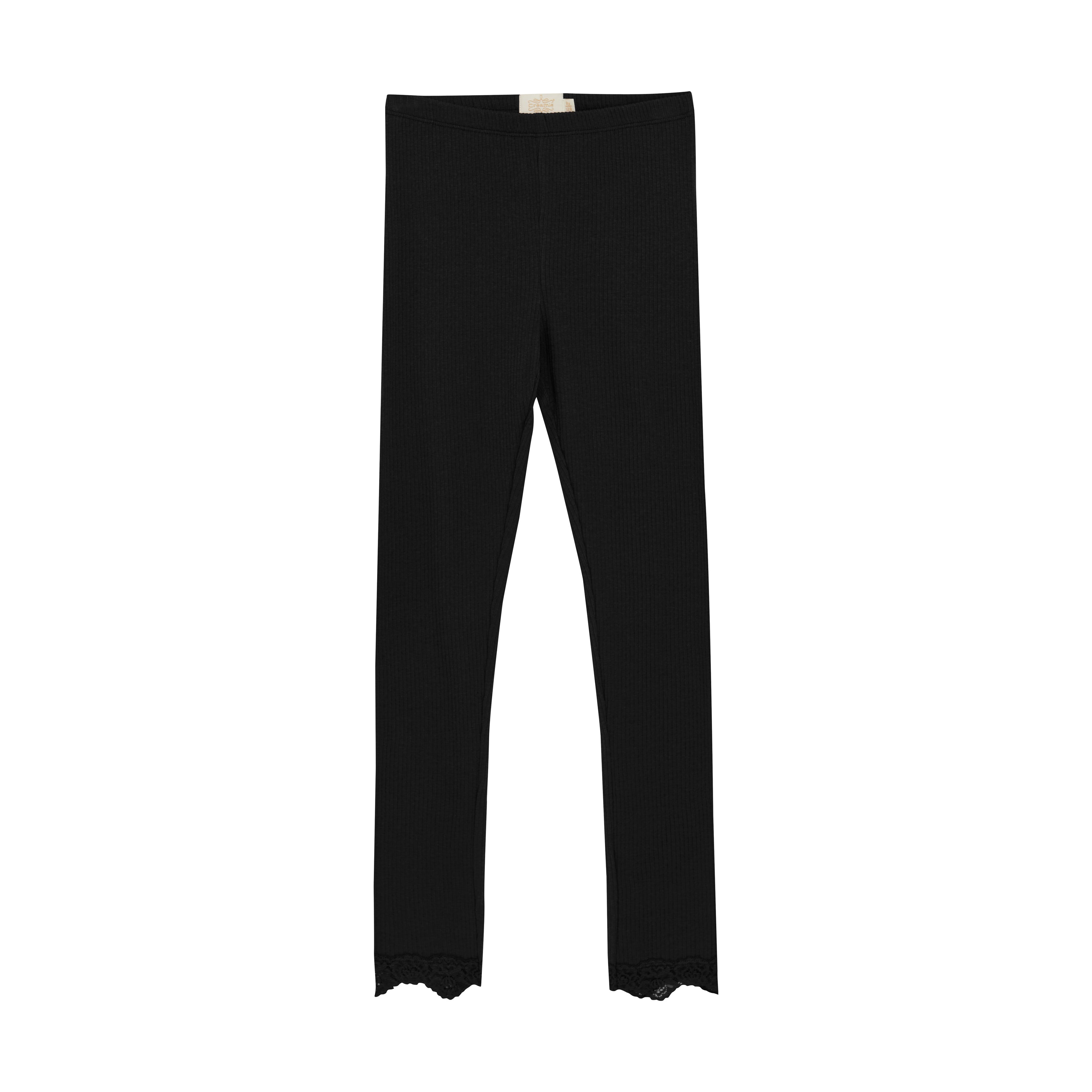 Ribbed Tencel Leggings from Creamie. These leggings have a straight leg, elasticated waist and lace trim at the bottom. There are no seams in the sides which makes them more elegant. They are made in a soft and delicious mix of cotton and modal.