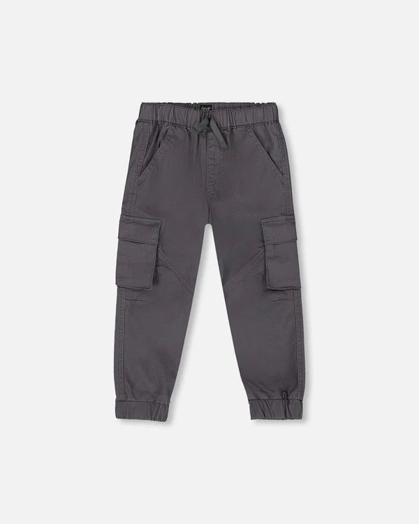 Add instant style and endless versatility to his wardrobe with these essential bottoms. In stretch cotton twill with a drawstring waistband, these pants feature a relaxed, comfortable fit with slant front pockets, elastic ankles, angled seams at the knees, and functional flap cargo pockets on each leg.