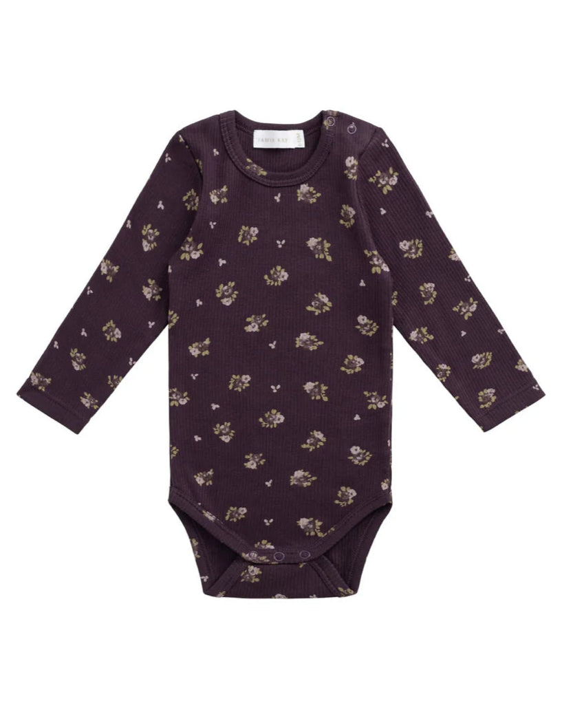 The Long Sleeve Bodysuit – Simone Huckleberry is a beautifully soft essential for your baby’s wardrobe. Featuring a rich purple hue with a delicate floral print, this fine rib bodysuit is designed for comfort and movement, with long sleeves and a snug fit that’s perfect for layering or wearing on its own.