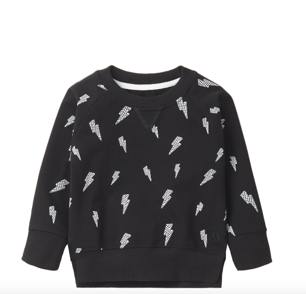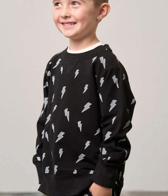 A classic pullover with a little extra fun. Featuring our fun lightning bolt print, this piece is designed to keep your little one comfy through every adventure. Made with a ribbed neckline, cuffs, and hem for a snug fit, plus rollable cinched sleeves and side slits for easy movement. Finished with our signature embroidered “LB” logo — everyday comfort with a bold twist.