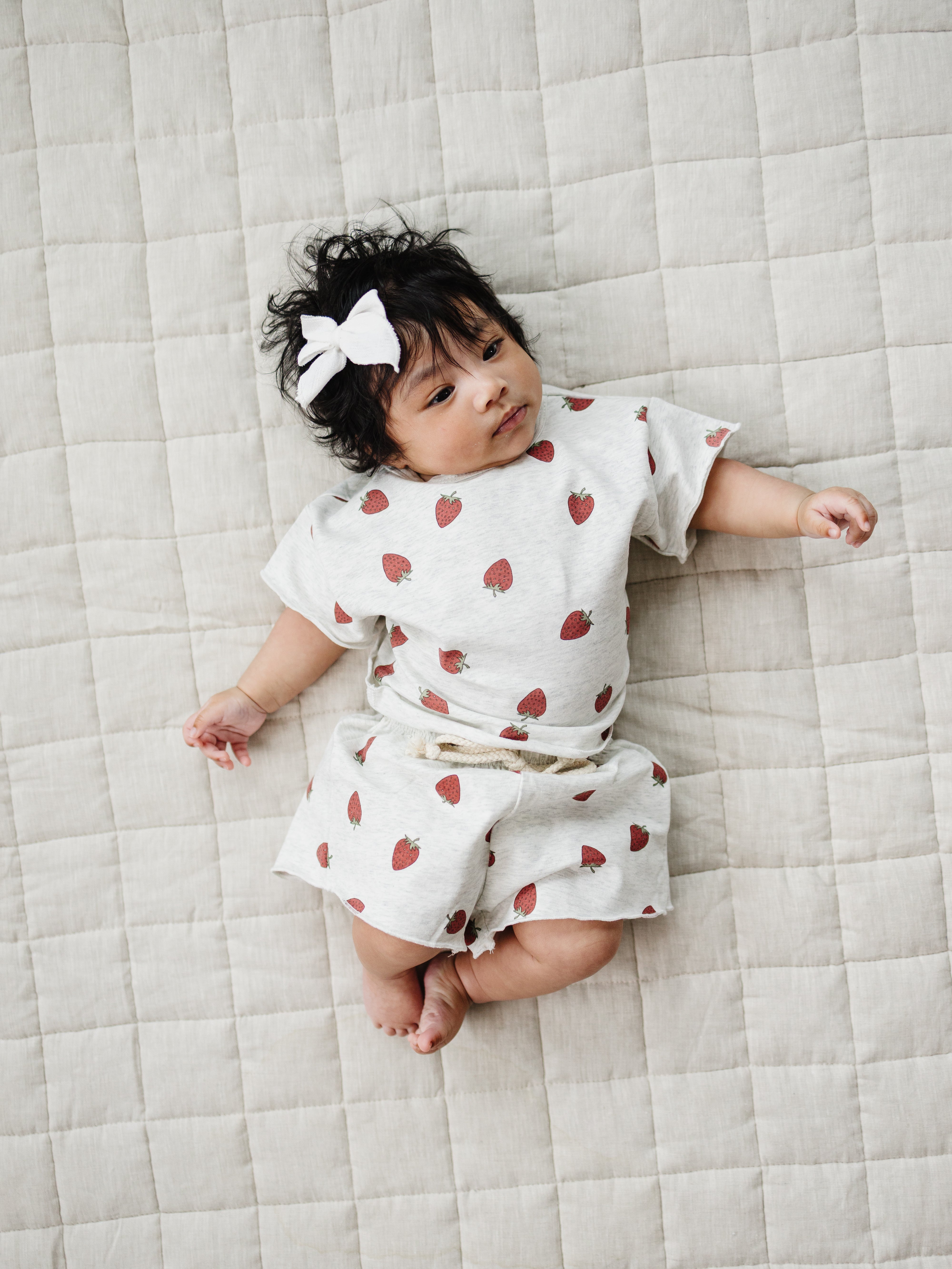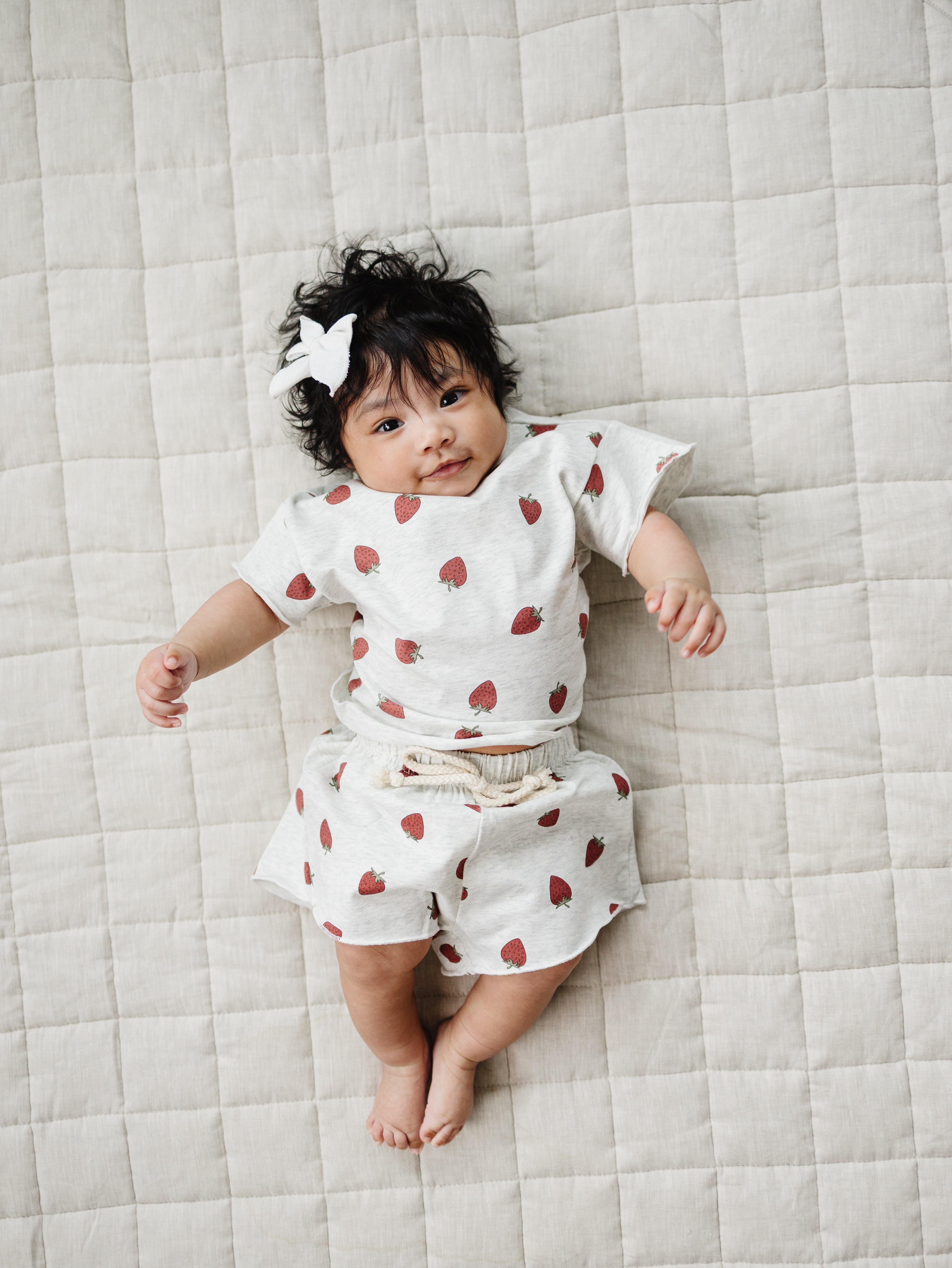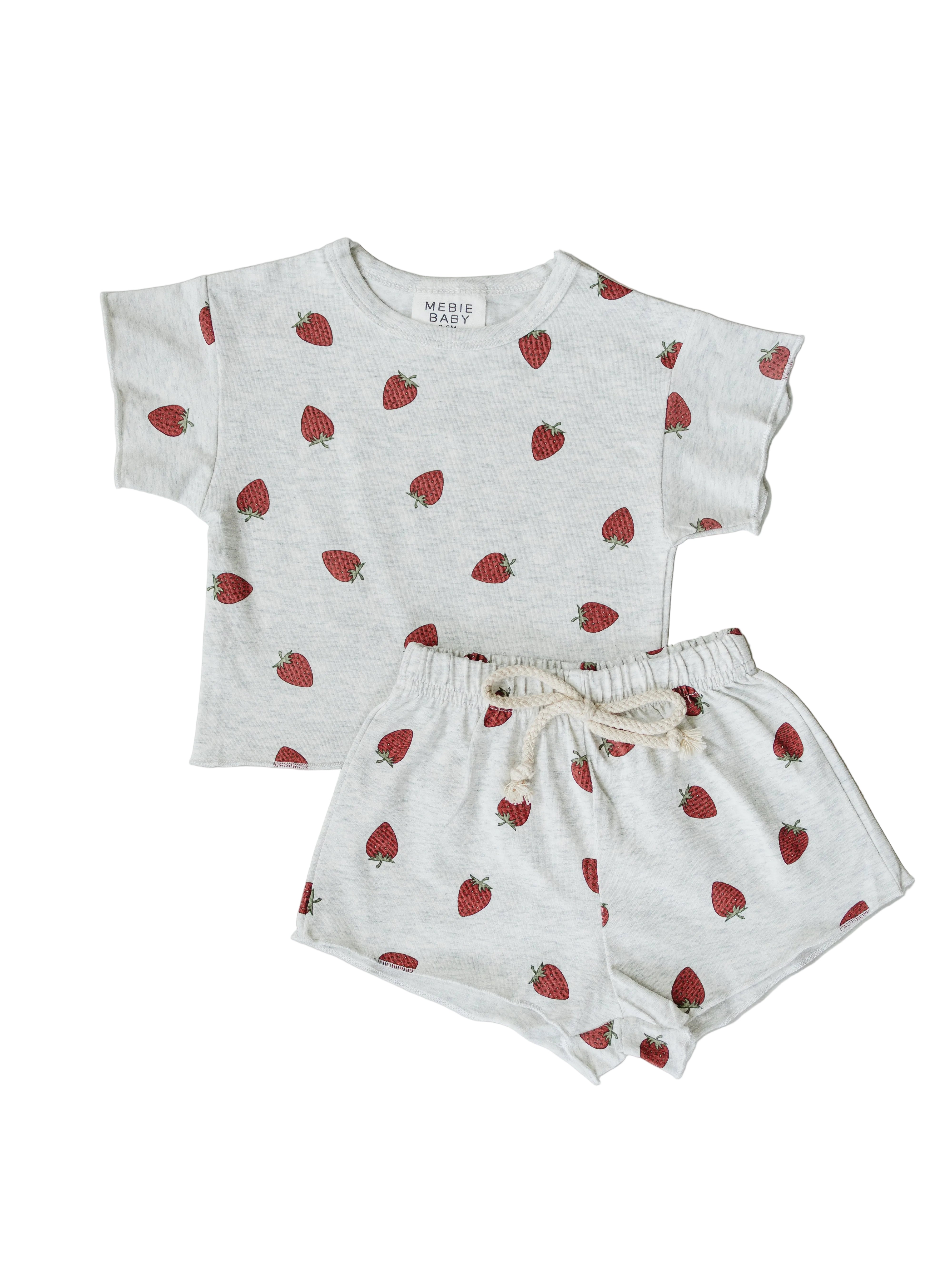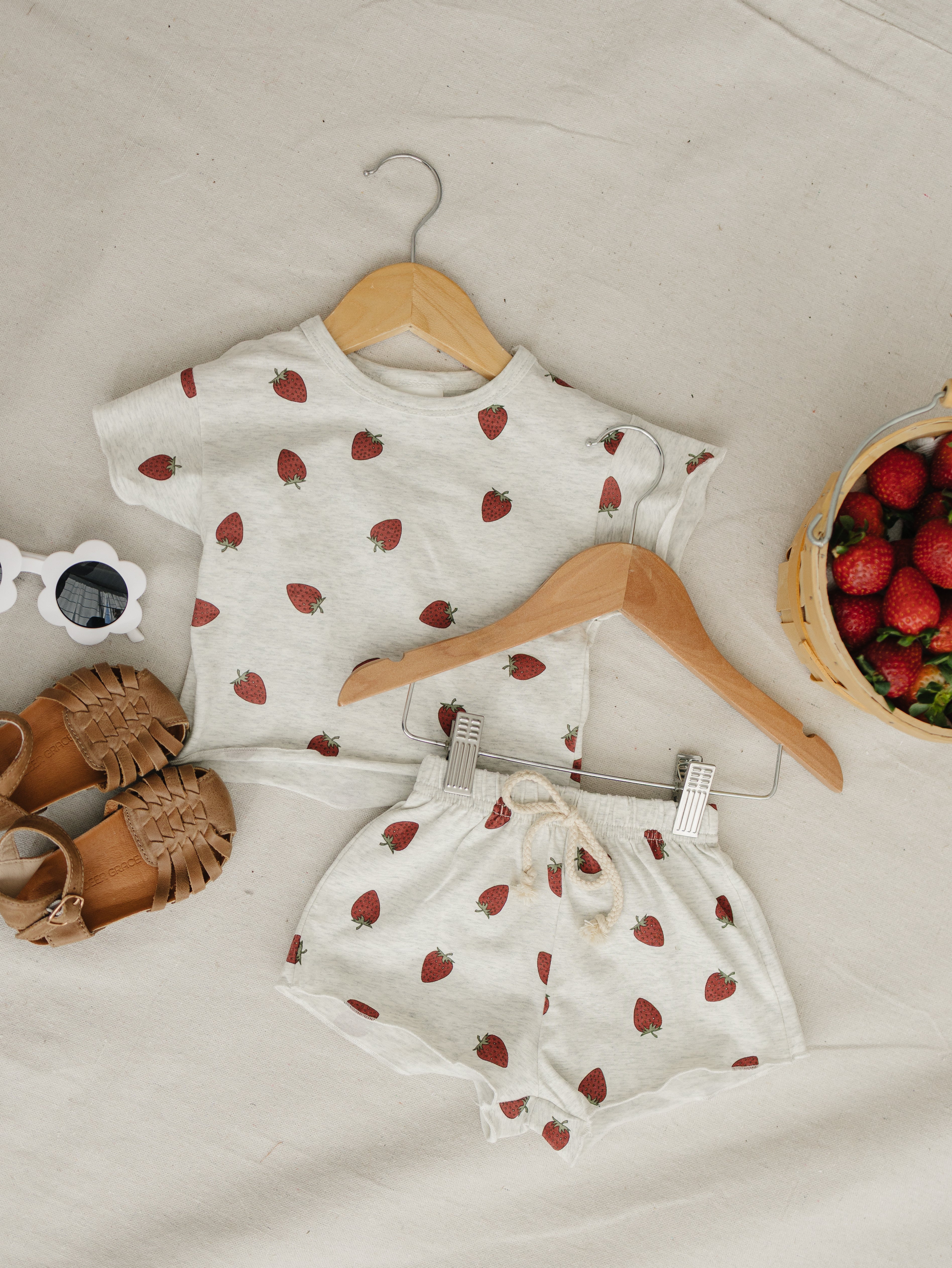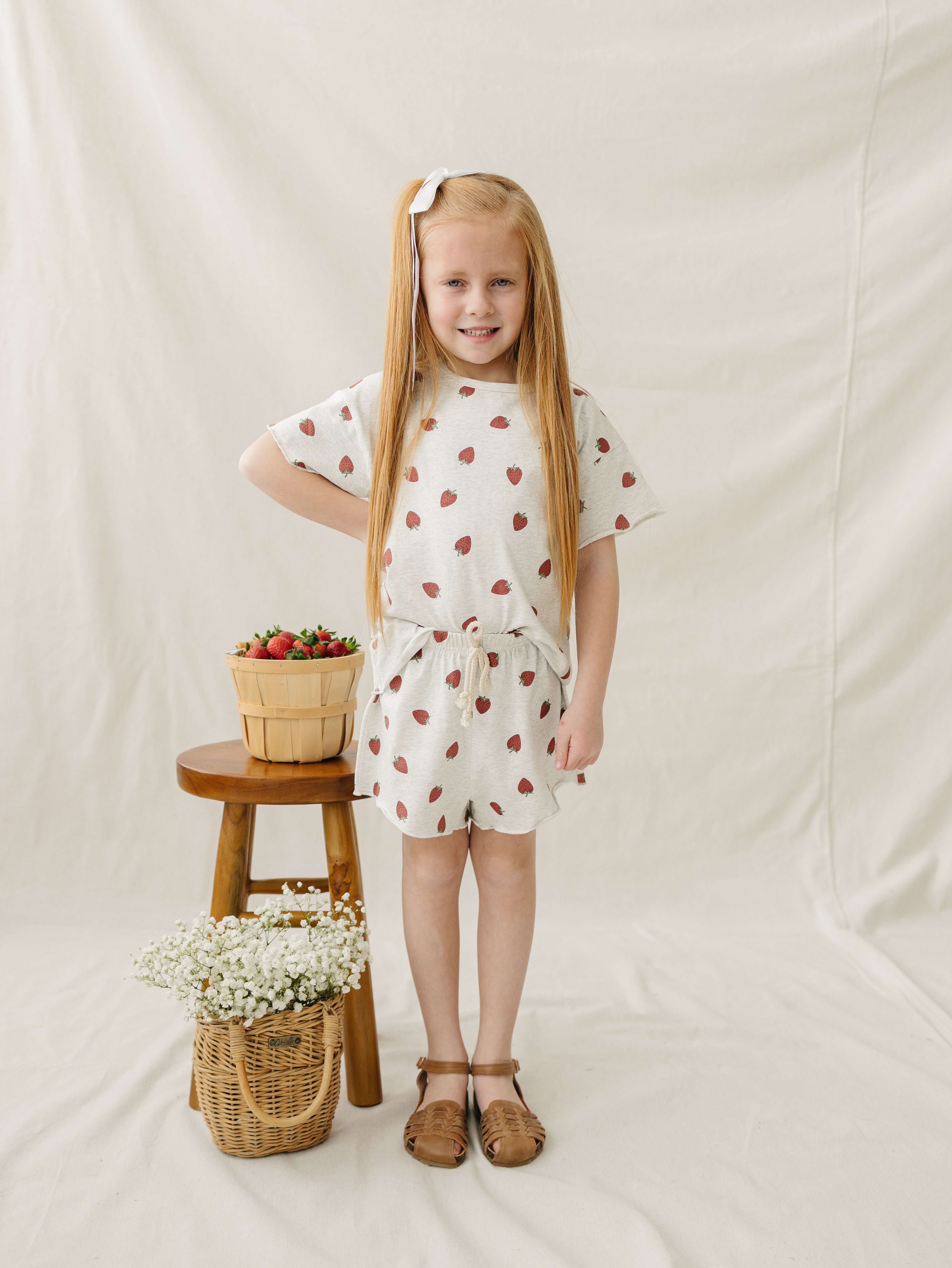 This Strawberry Short Set is a sweet and stylish addition to your little one's spring and summer wardrobe! Featuring a timeless print and trendy raw hem detailing, this set offers both comfort and fashion. Made from soft, breathable cotton, it's perfect for warm days, whether they're playing in the park, attending a family picnic, or simply lounging at home. The raw hem gives this set a casual, cool vibe that’s sure to stand out!