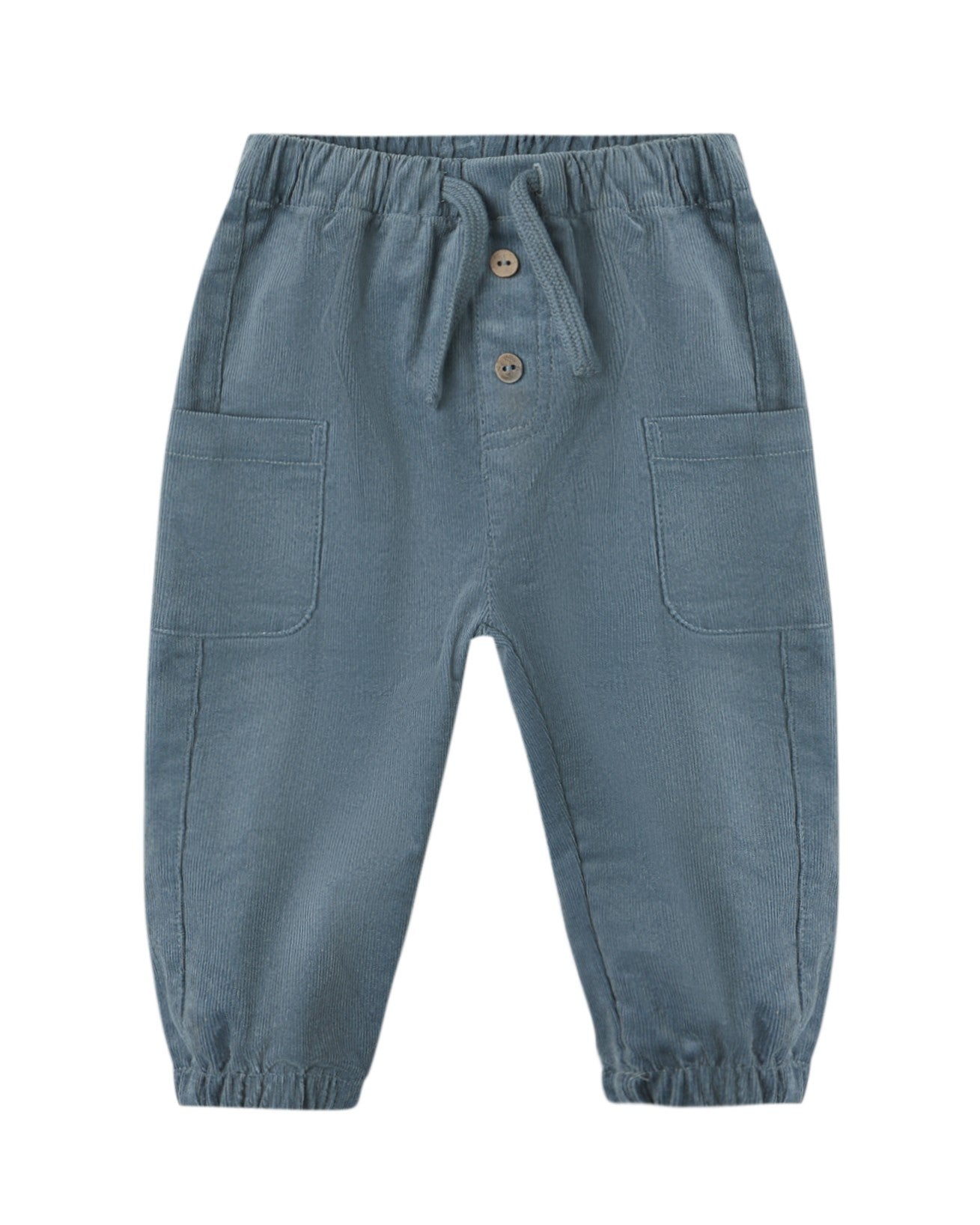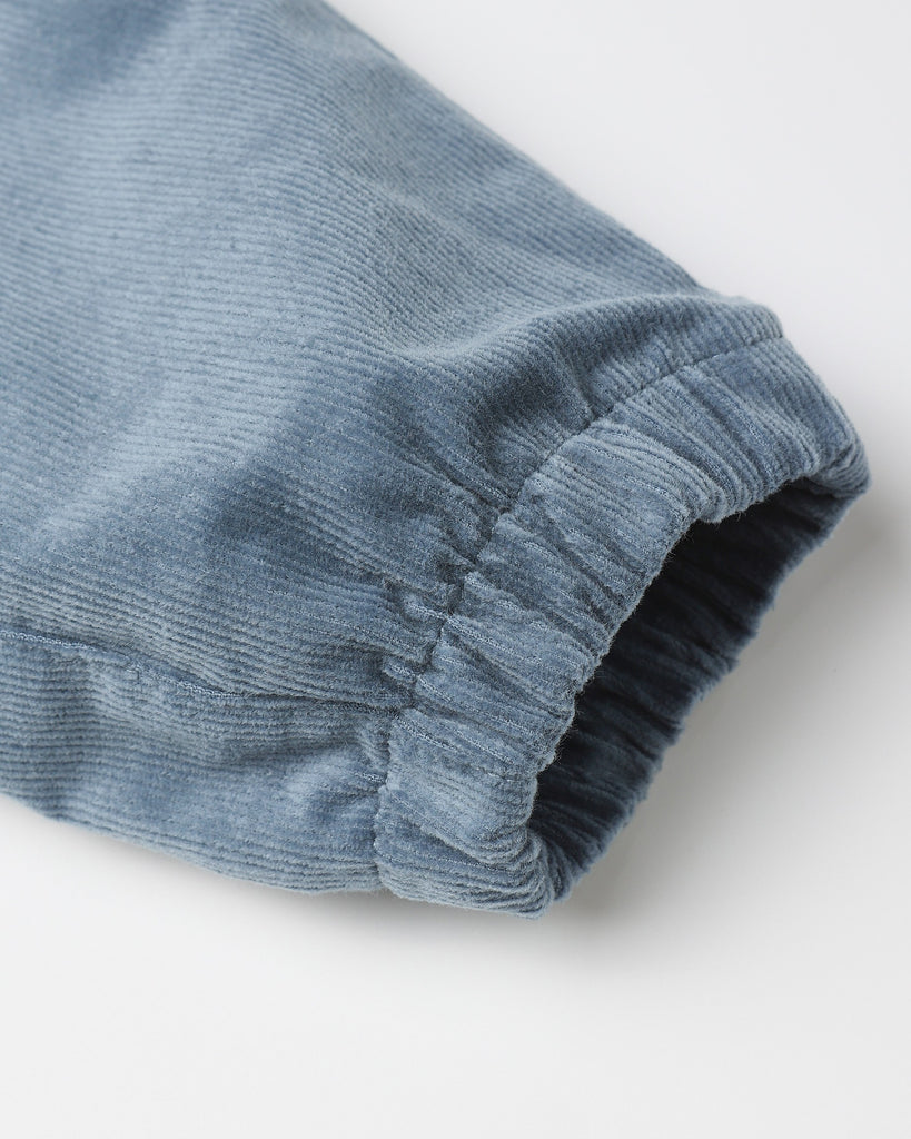 Comfortable corduroy pants with an elastic waistband and leg openings, adjustable drawstring, and side patch pockets.