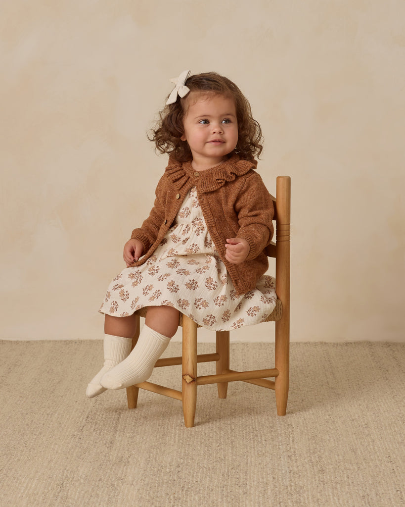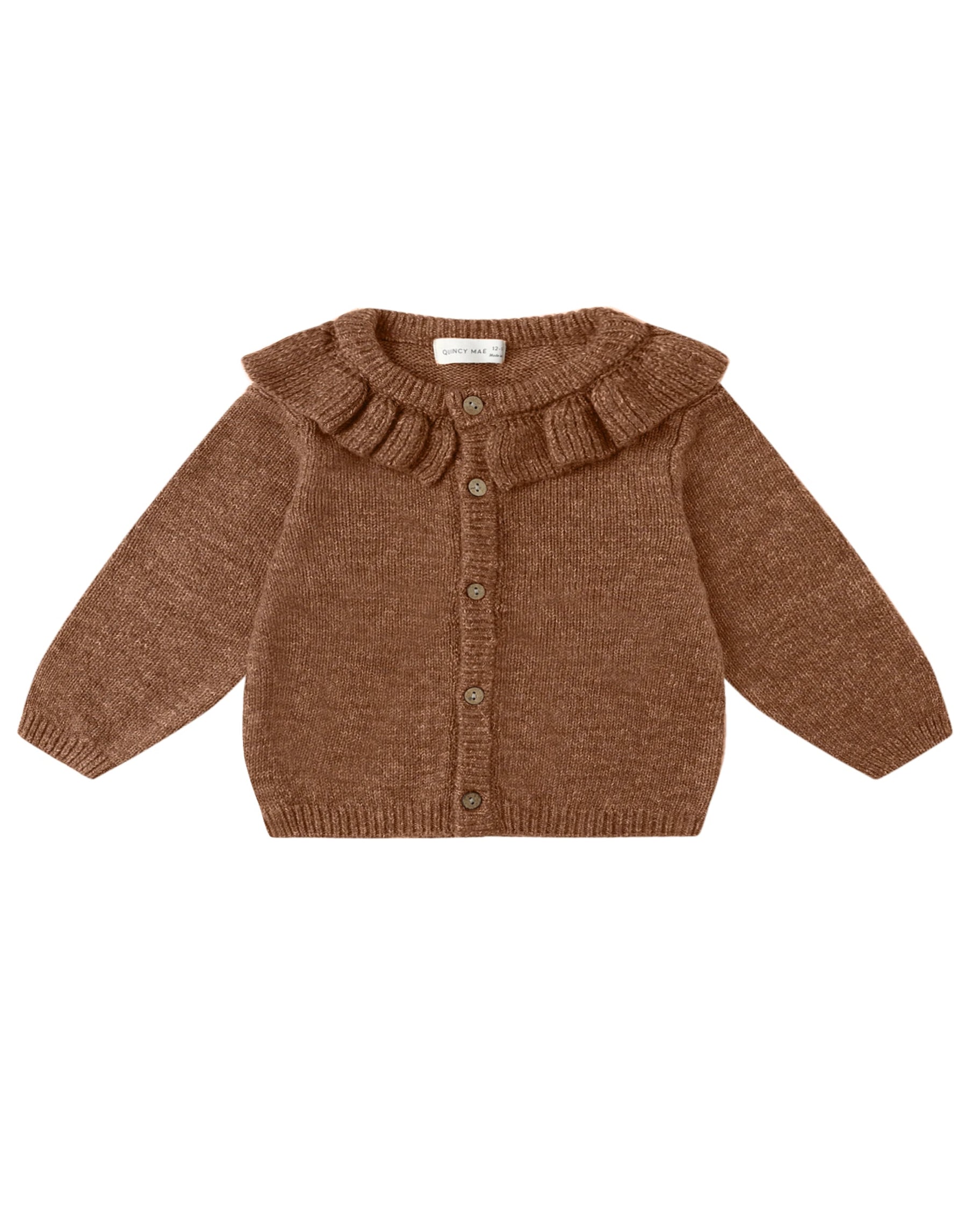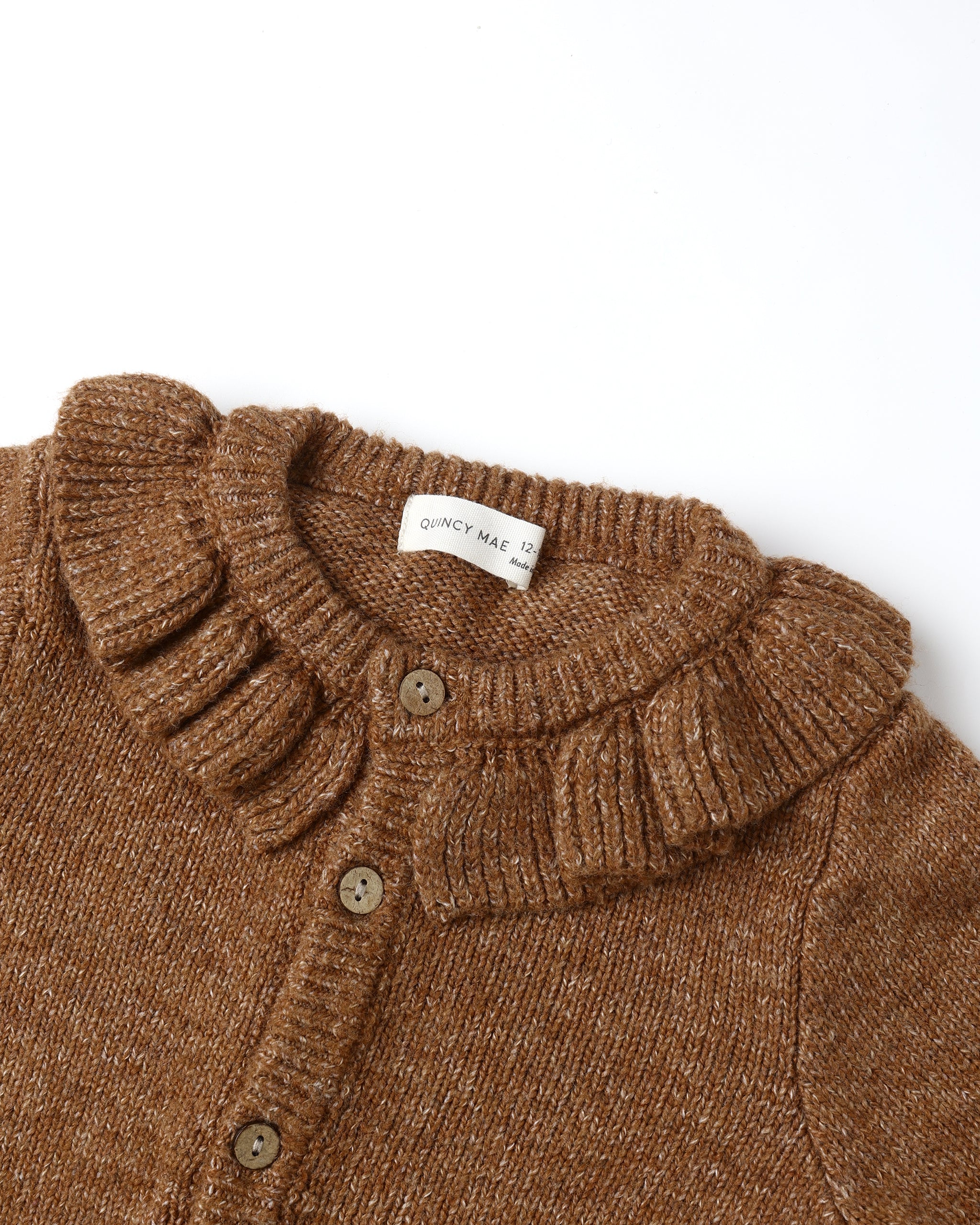 This sweet cardigan features a charming ruffle collar and coconut buttons, making it perfect for layering on fall and winter days.