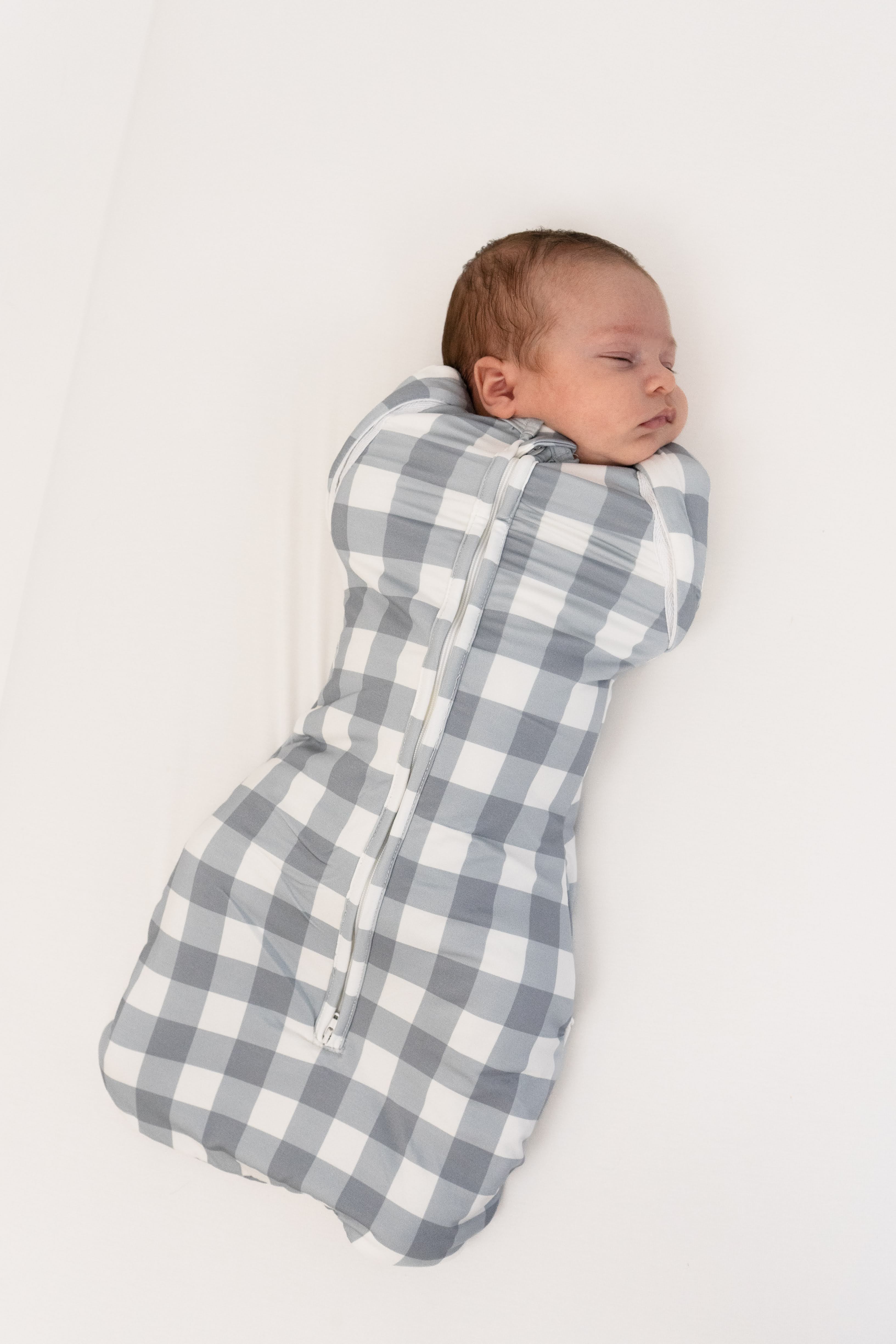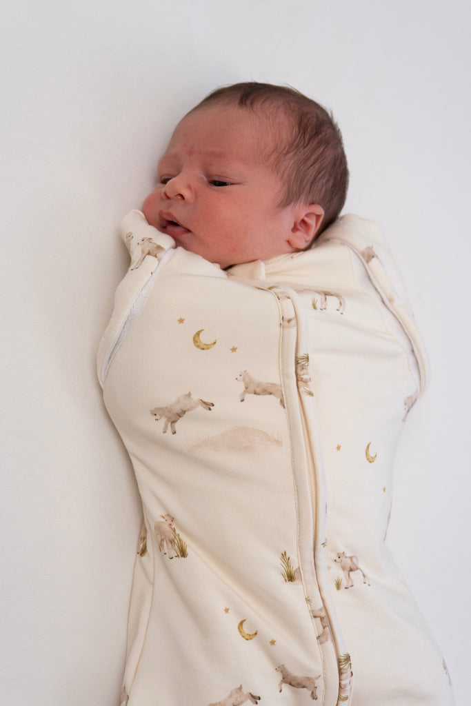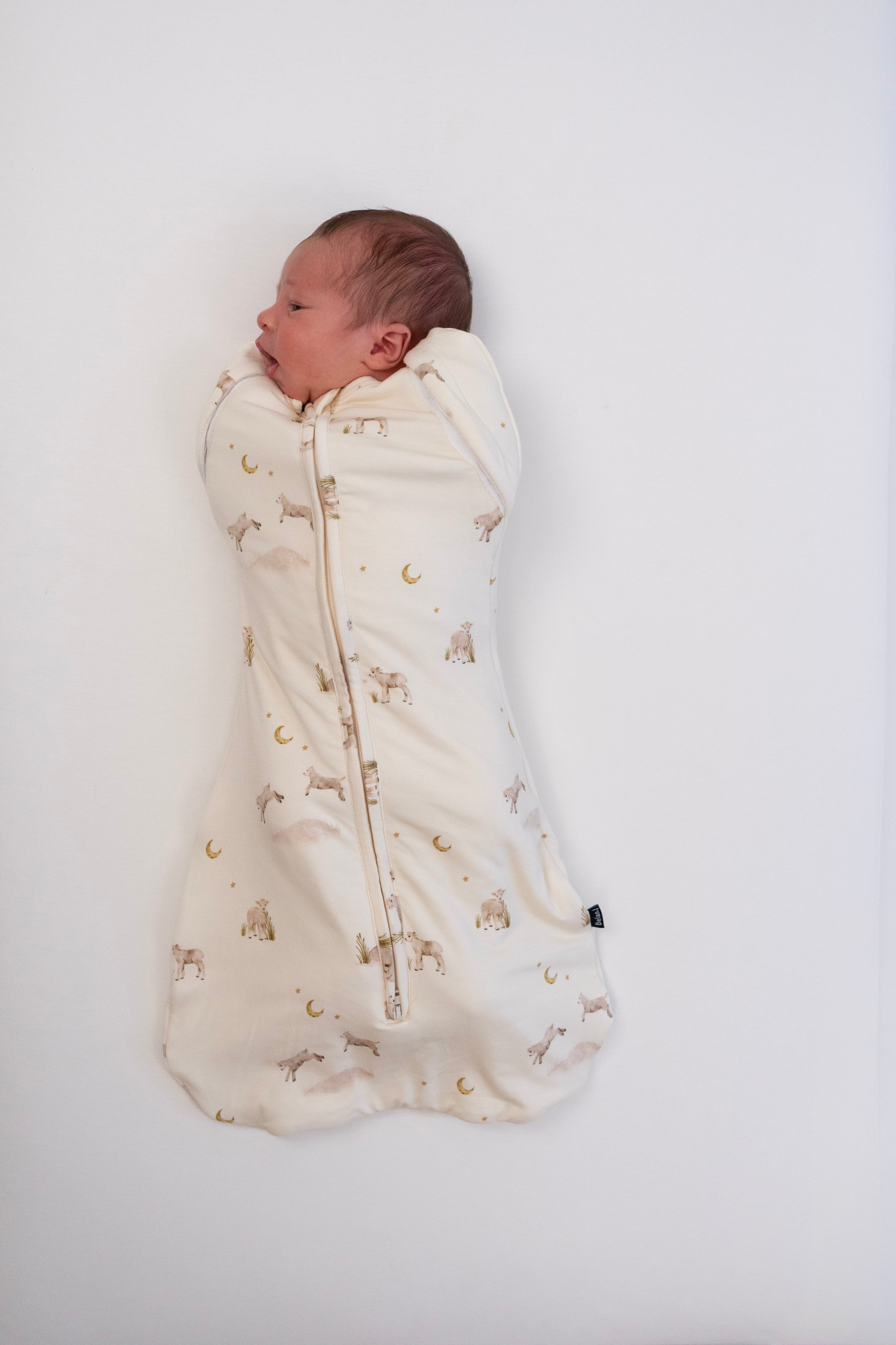 An upgrade to Belan.J's popular Swaddle Sack now with the option to swaddle arms in!