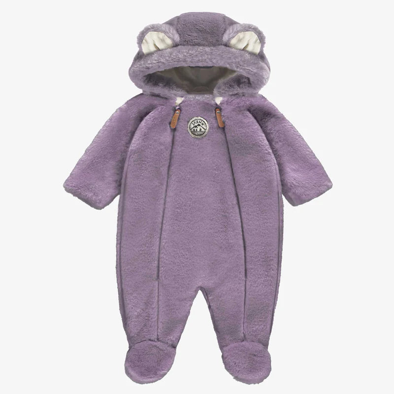 This mauve faux-fur one-piece is designed for ultimate warmth and comfort, featuring integrated feet and a double front zipper for easy dressing.