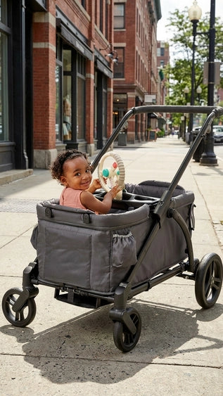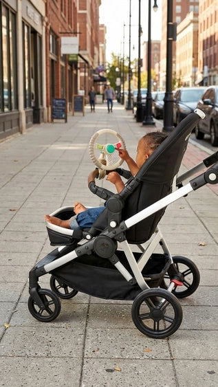 The Bitzy Driver™ spinning steering wheel toy makes travel extra fun for the littles.Three integrated fidgets including rocker switch, rotating wheel, and joystick. Wheel pivots to three angles. Plus an adjustable clip fits on most strollers, wagons, and shopping carts.