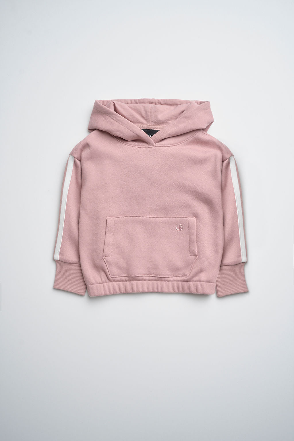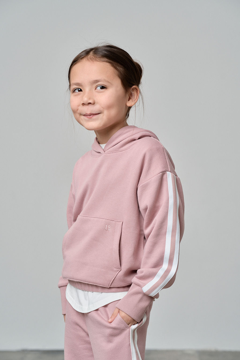 The Cropped Hoodie in Dusty Rosewood brings a sporty feel to everyday comfort. Designed with a slightly shorter length and relaxed elastic hem, it features a functional kangaroo pocket, white stripe sleeve detail, and their signature embroidered “LB” logo for a clean finish.