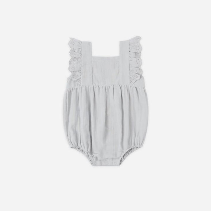 Ruffle scalloped sleeves with embroidered detail make the Naomi Romper a fancy fun look for spring. Designed with a keyhole back with button enclosure and bottom snaps for easy changing.